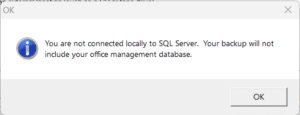 One installation of the 3D Inspection System software must be installed on the host/server computer, and on each client/workstation where it will be used. Full backups of your data that include the Office Management information can only be made from the host/server machine using its local connection to the SQL database. Backups made from a connected client/workstation machine may be made, but will be missing this important data and may display this type of message.